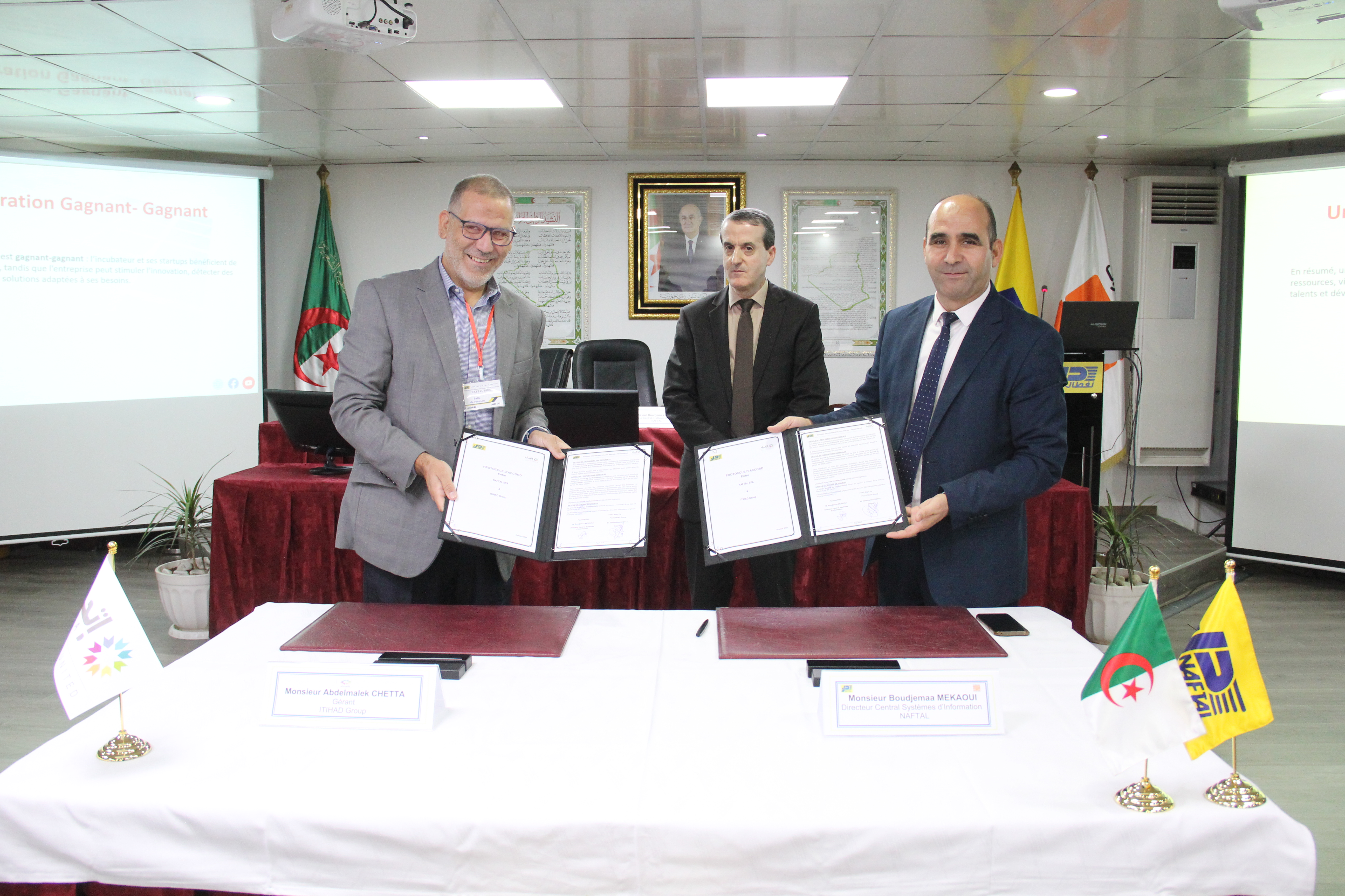 La cérémonie de signature s’est déroulée en présence du Directeur Central Systèmes d’Information, monsieur Boudjemaa MEKAOUI, du Gérant de ITIHAD Group, monsieur Abdelmalek CHETTA, du Directeur Projet Partenariat Naftal, monsieur Cherif SLIMANI, ainsi que les cadres dirigeants de l’entreprise.